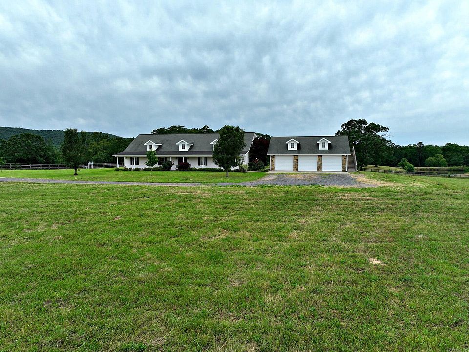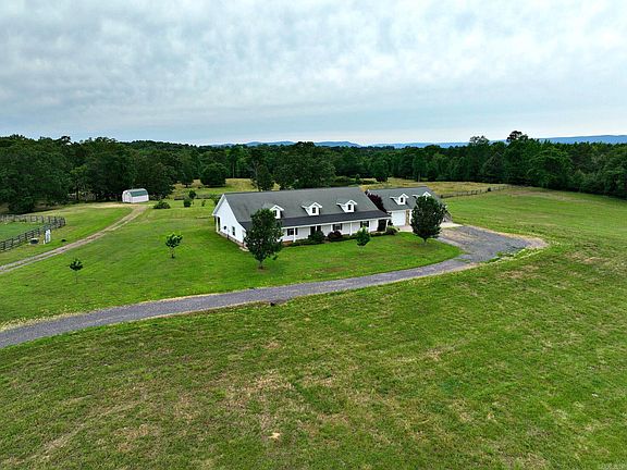Surrounded by the breathtaking Ouachita Mountains. The property is well-equipped for horse and cattle enthusiasts, with a barn with power, water and work pens ready for use. The tranquil pond adds a touch of serenity to the property, offering a peaceful spot to relax and enjoy nature. Enjoy easy access to nearby riding trails, ideal for exploring the stunning scenery. This beautiful 4-bedroom, 2-bathroom home, built in 2007, offers 2,544 square feet of elegant living space The open floor plan is designed for modern living, with a spacious kitchen that includes high-end appliances, ample counter space, and a large island. The living and dining areas are filled with natural light, creating a warm and inviting atmosphere. The 4th bedroom can also be used as a formal dining room or office. A convenient breezeway connects the main house to the garage, ensuring easy access in all weather conditions. The 3-car garage comes with a water hookup and a storm shelter, offering convenience and safety. Above the 3-car garage, a charming guest room with bathroom facilities provides a private and comfortable space for visitors.