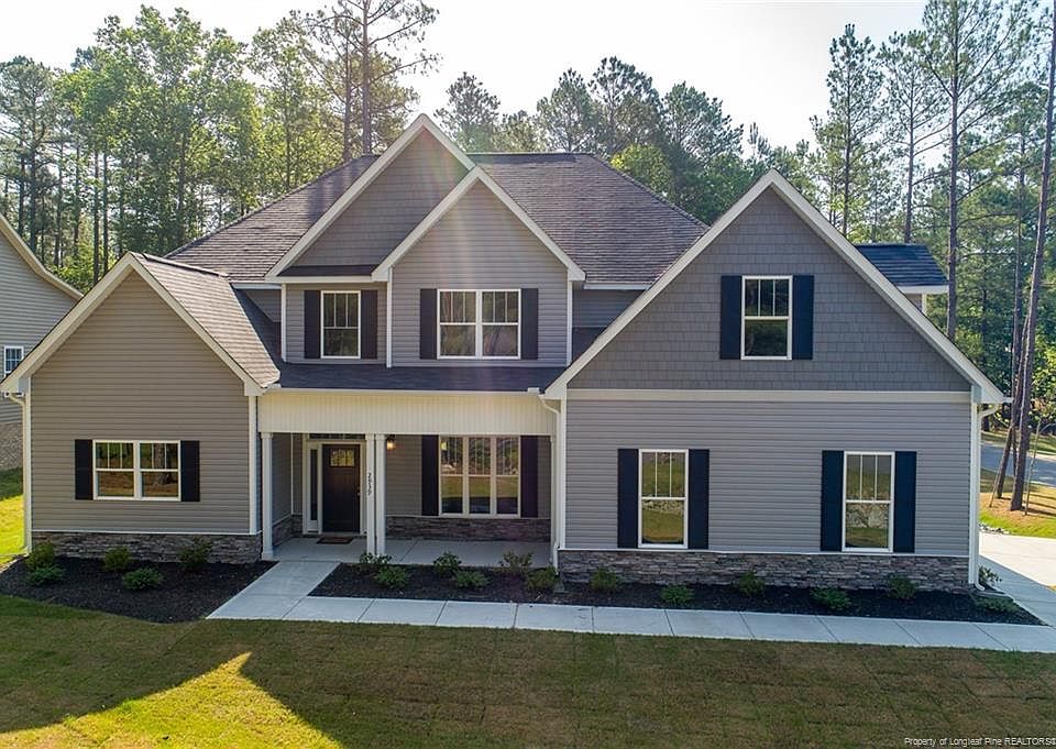Magnificent new construction in the gated community of Carolina Lakes! Home has all the bells and whistles and located on a nice private lot with side load garage, trees in the backyard, and large 10 ft. by 20 ft. covered porch! Open floor plan shows off wood burning stacked stone fireplace, a pristine island with farmhouse sink, and double ovens. Master on main floor with large WIC and vaulted ceilings in spacious master bathroom. Upstairs features four additional bedrooms and a bonus room. Home is designed to have a master bedroom downstairs and secondary master bedroom/bathroom upstairs. With plenty of space and quality features, this designer package home is a must see! Come vacation everyday in the gated community of Carolina Lakes!