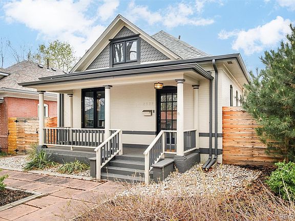 Design-forward and completely renovated, this West Highland gem blends historic charm with elevated, modern style. An inviting front porch welcomes residents into a light-filled main level featuring an open floorplan and wide plank hardwood flooring. A decorative fireplace is flanked by built-ins in the dining area. The kitchen stuns with a large island, Café appliances, abundant cabinetry and a range set within an original bay window. A powder bath with bold tile, a private home office and a shiplap-accented living room with French doors inspire both polish and personality. Upstairs, the converted attic serves as a unique third bedroom, while the primary suite offers a dual vanity, black-framed walk-in shower and custom closet storage. The expansive backyard boasts a composite deck, lush lawn and xeriscaping — ideal for entertaining. An oversized, detached 2-car garage adds convenience. Just blocks from Highland Square, this home offers thoughtful design and an unbeatable location in one of Denver’s most coveted neighborhoods.