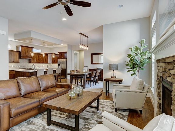 Harris Ranch Single Level! This beautiful home features an open-concept layout with stunning hardwood floors, 10-foot ceilings, 8-foot doors, & hand-troweled wall texture. The gourmet kitchen boasts an enormous slab granite island, custom cabinetry, a 5-burner gas range, double ovens, and an oversized pantry. The private master retreat offers luxurious living with a soaking tub, a walk-in shower with dual showerheads, dual vanities, and a generous oversized closet. The large utility room provides ample storage and a folding table for convenience. The third bedroom is versatile and can also be used as a home office. Enjoy a low-maintenance yard with a covered patio, perfect for outdoor entertaining. Additionally, this home features a rare 3-car garage with extra storage and EV charger. Solar panels significantly reduce electric bills to nearly nothing. Ideally located between the picturesque Boise River, foothill trails, and a vibrant restaurant scene. As a bonus, the refrigerator, washer & dryer are included!