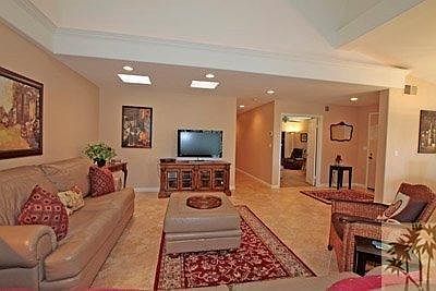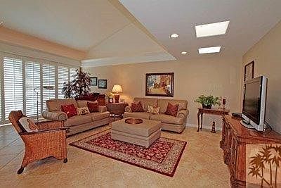 This Monterey Country Club 30 Max Plan (3BR/2BA) has been flawlessly updated using top-of-the-line materials throughout. You'll enjoy panoramic views of Mt. San Jacinto and the par three fifth hole of the South Course from the extended patio. One of Monterey CC's most private pools is also just steps away. The owner spared no expense in the complete renovation, including a seamless atrium conversion which adds square footage to the great room. The kitchen has been opened to the other living areas and includes beautiful cabinets, granite countertops, tile backsplash and under-cabinet lighting. Pendant lighting illuminates the breakfast bar. The great room includes crown molding with uplighting and all traffic areas have been tastefully tiled. Both bathrooms have been completely updated and recessed lighting and ceiling fans have been added throughout the unit. The garage has been finished and includes ample storage. This unit is being offered turnkey furnished...see it before it's sold!