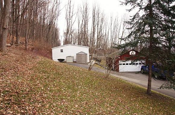 Country home with a view, set on a wooded 1.95 acre lot with paved driveway, oversized deck with gazebo, and two car garage/ workshop. Kitchen with oak cabinets, separate laundry room; the west wing includes a second living room with wood burning fireplace and two additional bedrooms with separate full bath. Many new improvements include: new furnace, new architectural shingle roof, dishwasher, 2 separate sheds, central air conditioning and power back -up generator. This well-maintained home could be your next home.