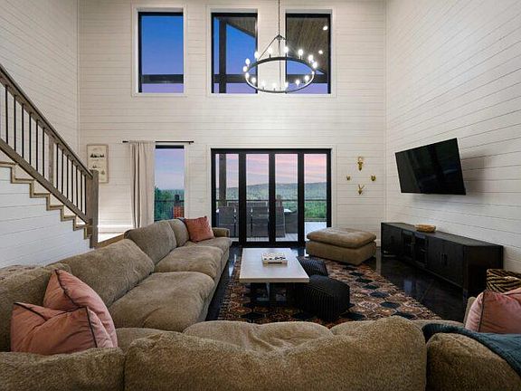 Discover a refined mountain escape at Orion’s Outlook, a high-end 7-bedroom luxury cabin including a bunk room that sleeps 26. The expansive living area features soaring vaulted ceilings, a dramatic floor-to-ceiling fireplace, and panoramic windows framing sweeping treetop views. A sleek, fully outfitted chef’s kitchen and spacious dining area make entertaining effortless.
