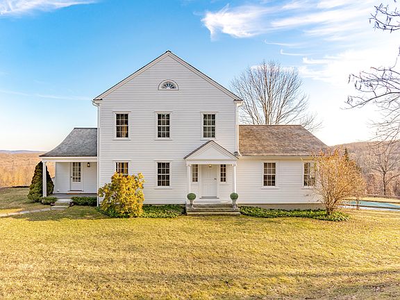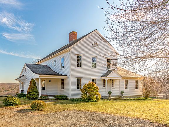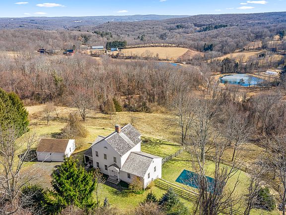 Exclusively listed by Madonna & Phillips Group. Once part of the 222-acre O'Brien farmstead (c.1860's) and currently abutting the Calder estate, this impeccable rustic farmhouse offers full privacy and 270° views on the most picturesque ridge in Roxbury. Essentially rebuilt in 2016, the tasteful top-to-bottom renovation spared no expense with white oak flooring and ceiling beams throughout, Carrara marble counters throughout, all bedrooms en suite, designer appliances, new electrical, new HVAC, new plumbing, new mechanicals, heated 16×32 gunite pool, and a full house generator.Done to perfection with taste and style, the 3,300±-square-foot home was designed as plug-and-play living for the voguish couple looking for a weekend/summer retreat or an indulgent primary residence. Central to the house is an open and bright gourmet kitchen with farmer's sink, marble island with seating and storage, Subzero and Bosch appliances, instant hot water, and separate dining area. The kitchen is accented with reclaimed barnwood beams and opens to a window-lined living room which offers ample space for entertaining friends, taking in the glorious view of rolling hills, or relaxing with a book by the handmade herringbone-brick wood-burning fireplace nestled between built-in bookshelves. The main living space opens to the elevated deck for extended entertaining: grilling, enjoying morning coffee, or sunset cocktails with a colorful and fragrant backdrop that changes with each season. The rear deck also joins the first-floor guest wing with marble bath, soaking tub and glass stall shower.On this main level, off the entry foyer, you will also find a formal dining room that can accommodate seated dinners of twelve and can also be accessed from the kitchen side. Completing the main floor is a powder room and library/sitting/overflow bedroom.A generously sized master suite on the second level provides a washer dryer, walk-in closet, marble bath with dual sink, soaking tub and glass shower, and hillside views. Opposite is the second en suite guest bedroom with full bath.Lower level offers plenty of storage options and comprises a large room for possible use as a theater/media room. A second room with walkout to pool can serve as a pool/changing room or gym, with full bath and laundry hookup. A third room houses mechanicals.Set on nearly 5 acres of sloping lawn, the house is finished in clapboard with cedar shake roofing and is set back far from a little country road at the end of a long private driveway. There's a full house generator, detached 2 car garage and clean energy efficient propane heat and central air.Walking distance to the property are miles of picturesque riding trails, and the nearby Shepaug River plays host to a natural waterfall and an old fashion swimming hole permitted for Roxbury residents only. Minutes from the historic towns of Woodbury, Washington, the Mayflower Auberge Resort, and the historic shopping village of New Preston.