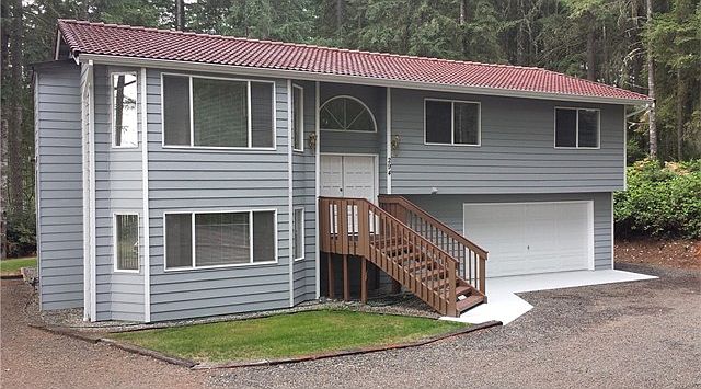 This is the home you've been looking for. Boundless possibilities and room to move around with over 1 acre of property. A large deck and patio running the length of the house could be used for entertaining or just relaxing and enjoying the sounds of nature. Expansive parking, efficient propane heat upstairs and down Master bedroom has its own sliding glass door access to the deck. Huge rec room downstairs w/ easy access to the patio and back yard.All with a secluded feeling yet minutes to town.