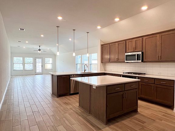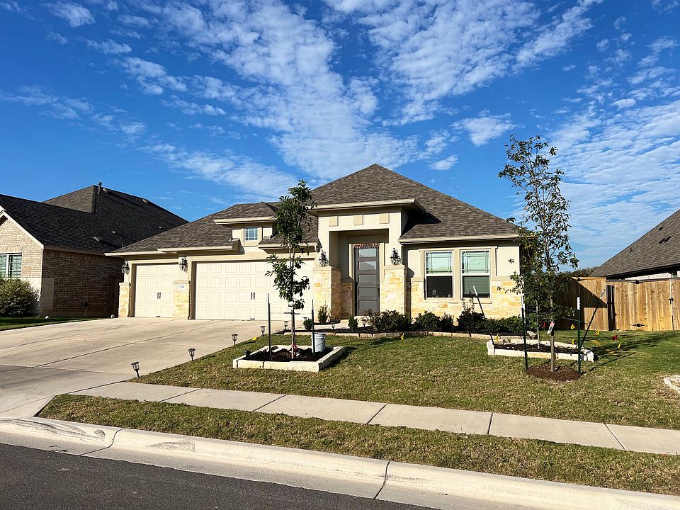 Beautiful 1-story home built in 2022 on a 60' wide lot loaded with upgrades. This 2,322 sqft house has four bedrooms, three full bathrooms, an office/flex room, and a 3-car garage. It is in an excellent community (6 Creeks) in Kyle of Texas with great schools, convenient access to I-35, 25 minutes to the Austin airport and downtown Austin, an easy commute to Texas State University in San Marcos, and a 45-minute drive to San Antonio. If desired, the home supports three separate bedroom suites to ensure privacy. It has an open floor plan with lots of excellent features like a spacious kitchen with an island, lots of windows for natural lights, carpets in bedrooms and tile floors in the rest of the house, bay window in the master bedroom, a deluxe master bath with a nice walk-in shower and garden tub as well as a large closet, surround sound in living room, no back neighbor, a lovely fenced-in backyard with an extended covered patio, and automatic sprinklers for added convenience. It has convenient access to Costco, HEB, Home Depot, Lowes, and two Medical Centers. Community amenities in 6 Creeks include a pool, a fishing pier on a private lake, playground, pavilion, trails, and pickleball courts. Lease duration is 12 months or longer. Rent covers HOA fees. Tenant is responsible for all utilities, recycling, internet service, and lawn/yard maintenance. Please submit a complete application for everyone in your group who is 18 years or older. Your Zillow application fee is NOT refundable regardless of whether your application is approved or not. It is extremely important that you provide accurate and complete information in your application. Please send messages from Zillow if you have questions. Absolutely no smoking or vaping; No aggressive breeds. Fees for pets are as follows: $300 pet deposit for each pet. The management and Landlord will select the most qualified tenant whose move-in date matches the availability of the house best. Minimum qualifications are: (1) combined monthly income is more than three times of monthly rent, (2) good credit, (3) excellent rental history, and (4) clean background record. A realtor representing the tenant will receive 40% of one month's rent after the tenant with an executed lease moves into the property. The realtor will supply a fillable most current TREC residential lease form and other applicable forms.