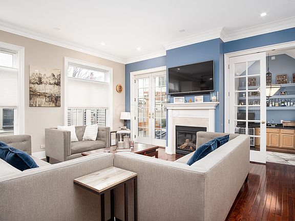 Luxury living one block from Schiller Park! A gated courtyard welcomes you to this unique & functional 2 story. Wood floors & 12' ceilings throughout the 1st level. Kitchen features quartz counters, premium appliances, 42'' cabinets & coffee bar. Living room w/wall of windows, crown molding & gas fireplace. Sunroom off the main living area features a wet bar & access to the patio. Two spacious en suites, an office space and laundry room upstairs. The primary bedroom is grand & elegant, featuring vaulted ceilings, wood floors, fireplace & wet bar. Primary bath is spacious w/dual vanities, jetted tub & separate shower. 2nd bedroom has an owner's bath as well. Finished LL w/egress windows (great 2nd living area). 1 bed down w/full bath. Private back patio w/gas fire pit & water feature.