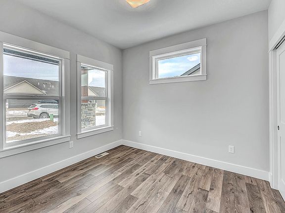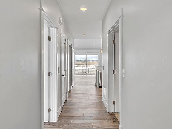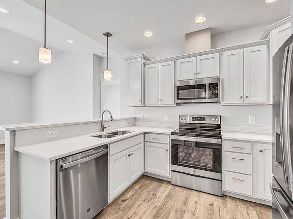 This spacious 2 BD / 2 BA condo features mountain views, an attached 2-car garage, a covered outdoor living space and an inviting covered front porch entry. You'll find upscale finishes throughout from quartz countertops, laminate flooring and tiled wet areas inside to stonework, timber features and colored stamped concrete accents on the outside. Vaulted ceilings set off the great room. The kitchen features a peninsula, soft-close cabinets, stainless steel appliances and walk-in pantry while the owner's suite features vaulted ceilings, a large walk-in closet, private water-closet, tiled walk-in shower, shelving for linens and a double vanity. You'll love the laundry room with sink, large hallway coat closet and additional storage in utility room off the garage. Low $150 / mo condo fee.