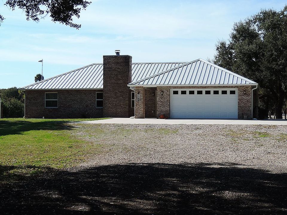 Concrete Block and brick Construction house on 4.9 acres of Land with small pond. Au-Res Zoning allows for variety of uses on your land including raising livestock or planting groves. Hvac system replaced 2017. New 24-gauge commercial panel roof installed with peal and stick underlayment in 2019. All New impact windows installed 2019. All new ceiling fans installed. Well with water treatment system. Open floor plan with wood burning fireplace in great room. 50 amp rv plug. Large 30 x 35 detached garage/shop with 3 overhead doors. 220 power. Air compressor plumbed into shop. 24 x 24 covered back patio. Less than 1 hour from Canaveral National Seashore for fishing, beaches etc.