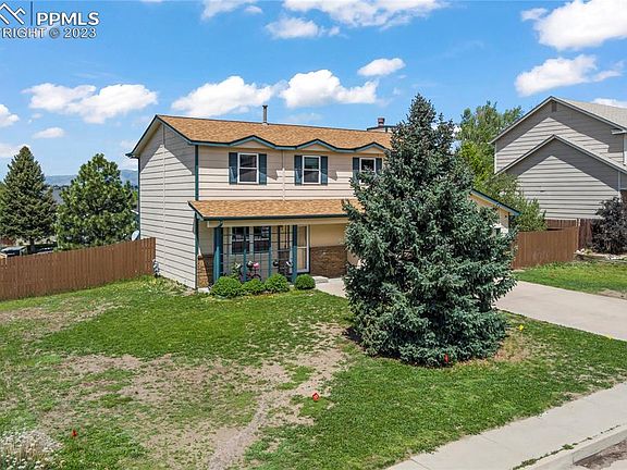 Great 4 bedroom, 3 bath, 2 car garage home with pikes peak view on quiet street. When you enter the home to the left is the living room with laminate wood flooring and a window seat and attached to the living room is the dining area. The dining area has laminate wood flooring and a window with a Pikes Peak view. Straight ahead from the front door is a hallway to kitchen, with a half bath to the left. The kitchen includes all appliances, has laminate wood floors and has a window over the sink with a view of Pikes Peak. To the right of the kitchen is a eating area and the family room. The family room has laminate wood floors, gas fireplace, coffered ceiling and walkout to the back yard. On the upper level is the Primary Bedroom, master bath, 3 additional bedrooms, laundry closet and a full bath. The primary bedroom is over sized, has carpet, ceiling fan, walk-in closet(10 X 6) and a attached 5 pc bath. The primary bath is tiled with double vanity, separate shower and soaking tub and window over the tub with a Pikes Peak view. The walk-in closet can be accessed from the bedroom or the primary bath. There is also a automatic sprinkler system, central air and a storage shed. And one more time a great view of Pikes Peak from the back of the home.