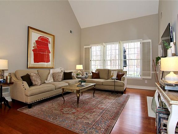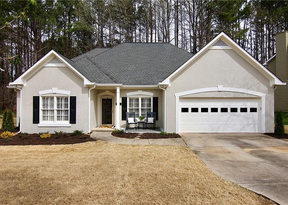 This lovely one level ranch home is sure to impress. Cathedral ceilings in the great room with a double sided fireplace open to kitchen and breakfast nook. Eat-in kitchen features granite counters with a breakfast bar, stylish modern Samsung appliances, white cabinets and butlers pantry leading to the dining room. Breakfast nook can also be used as a sitting area with access to the fenced in yard with a new large concrete patio. The primary bedroom features a recently renovated spa like bathroom with an oversized shower and dual vanities. Two additional bedrooms, a full bathroom and a laundry room complete this open layout. East/West facing home with natural light throughout boasting beautiful plantation shutters. Extra storage above double attached garage. Community HOA has a pool and playground. This highly desired JOHNS CREEK location gives you access to great schools including Mt. Pisgah. A path within the neighborhood creates a shortcut to Starbucks, Fresh Market, Grocery Stores, Bruster's Ice Cream, fitness centers, dry cleaner, restaurants and more! Newtown Park around the corner with trails, a dog park, playgrounds, sports fields, adult & youth organized sports, tennis courts, camps, outdoor concerts, movies, fitness classes and festivals! Easy access to GA400 makes this home conveniently close to all major amenities. Nothing to do but move in and enjoy.