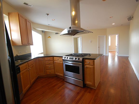 Stunning penthouse with 3 outdoor spaces. Two bedrooms, two bathrooms, living room & kitchen downstairs, upstairs has an additional room - ideal as a den or office - and a 760sq ft private deck with incredible city views. Balconies lead off both kitchen & master bedroom. Kitchen features s/s appls & range hood, maple cabinets & breakfast bar. Hardwood floors throughout. Storage unit & gated parking included. Public transport, highway access and all the amenities of Logan Square nearby.