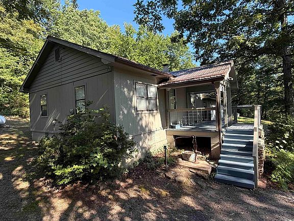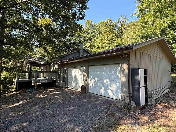 Take a leisure drive down the gravel driveway, past your pond with the beautiful rock dam, to your oasis in the woods. The home offers 1,560 sq. ft. under roof, including 867 sq. ft. of living space and a 693 sq. ft. 2-car garage/workshop. Features include 2 bedrooms, 1.5 baths, and an open kitchen/living area with all appliances conveying. There is a partial basement that includes a Fisher wood stove, storm shelter space, and plenty of storage for canned goods. The home sits on 38 +/- acres of mostly wooded, hilly terrain with approximately 700’ of Tick Creek and a beautiful swimming/fishing hole. There is also a separate studio building that could be office, overflow room for guests, etc. Below the studio is a barn with chicken coop and space to park your ATV and tractor. Enjoy privacy, abundant wildlife, and year-round beauty—perfect for a full-time residence, weekend getaway, or recreational retreat.