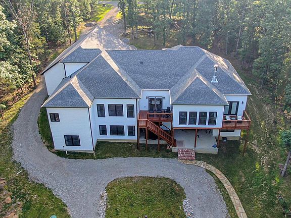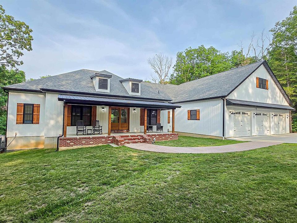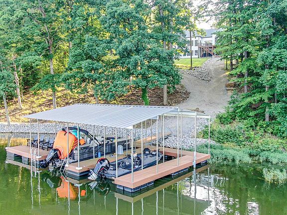 Premier waterfront living on the Peninsula at Lake of Egypt! This stunning 5BD/5BA home offers over 6,200 sqft. of luxury, privacy, and breathtaking views. Nearly every room captures the lake. Including the expansive kitchen, spa-like master suite, oversized three-season room, walk-out basement, and 110' of shoreline with a custom 2-slip dock. The main level features a large kitchen with walk-in pantry, open-concept dining and living area, stone fireplace, laundry room, office, and a 3-season suite. The spacious master retreat includes a walk-in closet, luxurious bathroom, private deck, and stunning lake views. Upstairs is a 500 sq. ft. private bedroom with full bath, walk-in closet, and two built-in bunk beds. Perfect for guests or kids. The finished walk-out basement includes a bedroom, full bath, and a huge bonus room ideal for a gym, game room, or media area, plus a covered patio overlooking the lake. A wooded gravel drive leads to a 3-car garage and a beautiful white home with black accents and custom wood details. A gravel golf cart path and rock steps provide access to a custom dock with swim platform and jet ski lifts. This is Lake of Egypt living at its finest! Luxury, lake life, and privacy in one perfect package!