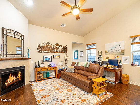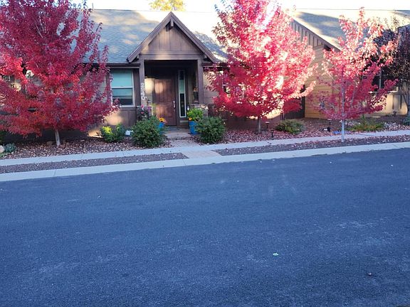 This lovely single level home is located on a friendly and quiet street with stunning views of the San Francisco Peaks. With a truly impressive floor plan this 2 bedroom, 2 bathroom, 1,371 sq ft home feels spacious and welcoming. The living room provides a cozy feel with the gas fireplace, hardwood floors and opens beautifully into the kitchen/dining area. The kitchen and dining room offer several upgrades, a breakfast bar and a perfect view of the maple trees out front. The primary suite boasts a beautiful barn door, a walk-in shower, dual shower heads, dual sinks and large walk-in closet. The guest suite has a private bathroom entrance, nice natural light and easy access to the back patio. The extended patio out back is a little slice of heaven with an amazing view!