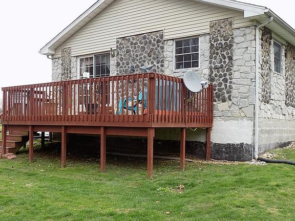 Attractive 3 bdrm, 2 full bath ranch, w/ unique stone and log exterior. Home features an awesome eat- in- kitchen , center island, hickory cabinetry, lg great room w/ vaulted ceiling, six panel doors through out. Partially finished basement could be additional living space. Large deck w/ nice view of the back yard, plus a storage barn, covered front porch. New roof and heat pump. Move In ready!