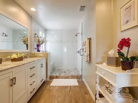 2BR'S + A HUGE LOFT WHICH CAN BE 3rd BEDROOM. SPECTACULAR & COMPLETELY REMODELED. DONE RIGHT!!!! Bright and Light with Beautiful Wood Ceramic Tile throughout the first floor. Custom White Shaker Style Cabinets and Breakfast Counter adorn the Completely Remodeled Kitchen. GE Stainless Appliances with Beautiful Counter top. Floor plan has been Opened up between View Kitchen Nook and Living Room. Stunning Custom Stacked Stone Fireplace. New Sliders to Panoramic View Yard. Separate Formal Dining Room with Custom Chandelier complete gives Modern nuance to what some may describe as hints of a Coastal Beach Motif. Half Bath downstairs is totally remodeled. Ascend to the upper level with Master Bedroom Suite with Private Panoramic View Balcony, Expansive Ceiling, Walk-in Closet, and Master Bathroom Suite with Huge Walk-in Shower. Secondary Bedroom Suite has Private Remodeled Bathroom with Cathedral Ceiling and Large Window all the light you need. The ADDED CUSTOM LOFT has ultra high ceiling and has custom handrail which disappears from sight as you enjoy the view out the upper Living Room windows. Hurry - This Totally Turnkey Pristine Home will not last long!