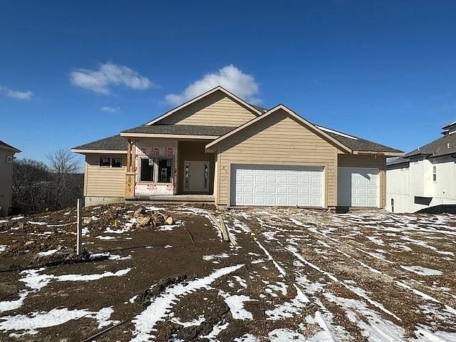 Brand New, still time to make selections, black windows with a walk out basement that overlooks Lake Olathe Park. Perfect outdoor setting for Kansas Sunsets with a North facing backyard that has a 18x10 covered patio. Basement is lined with windows for the perfect amount of natural light. This new and improved floor plan featuring larger master closet. Plus check out this views!! This is one of Prieb Homes most popular reverse 1.5 story plans. The Payton is our only plan that has THREE Bedrooms on the Main Floor and ADDITIONAL bedroom in basement. Basement has full bathroom and HUGE rec room featuring tons of light! Kitchen has large center island facing living room, soft close kitchen cabinets, apron front sink, recirculating vented hood and GE profile SS appliances. Photos of previously completed home, some features of the home may differ