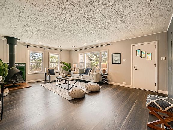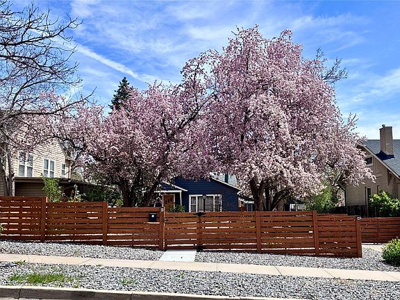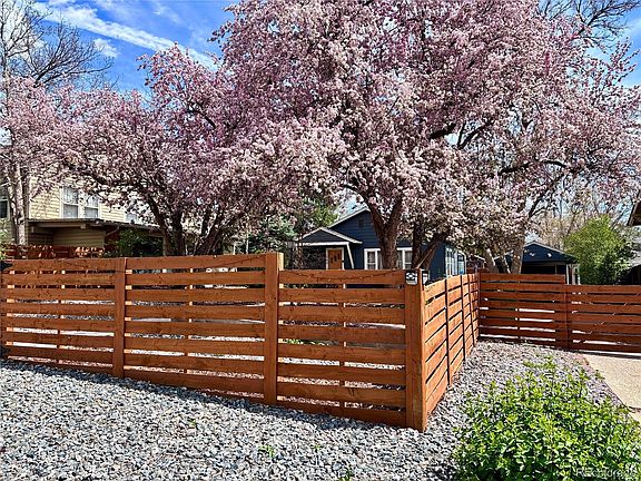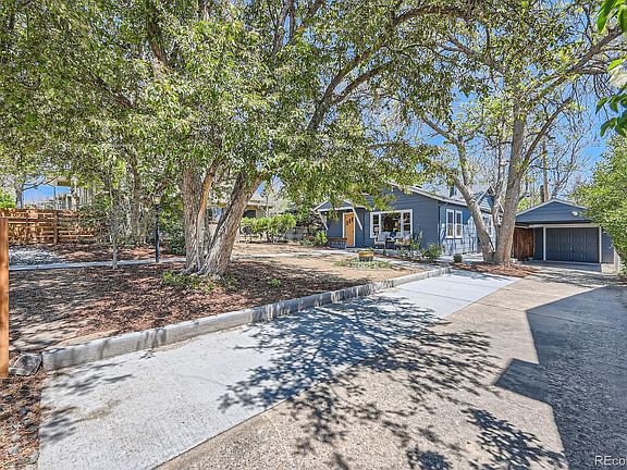 This charming Olinger Gardens home offers an exceptional lot and location. Nestled in southeast Wheat Ridge, it’s just a stroll or short drive to Edgewater, Sloan’s Lake, West Highlands, West 38th Avenue, and Tennyson Street. Walk a block to the local library or visit the butcher shop and restaurants on W 29th Ave. Prefer to stay in? Bask in the breeze through century-old cherry blossom trees that bloom bright pink in spring, or unwind on the stamped and stained wraparound patio. The house sits toward the back of the lot, offering privacy and ample space for furry friends to roam the fully fenced yard. Inside, you’ll find rich-tone CORETec LVP flooring, a stylish paint palette, and updated lighting throughout. Enjoy year-round views through the living room’s picture window and cozy up to the mid-century modern freestanding fireplace. This home has true one-level living with no stairs from yard to home. The two bedrooms are connected by a shared door—ideal for a primary plus home office, nursery, or guest room. The sunlit full bath features a clawfoot soaking tub with retro tile surround and stacked laundry. The kitchen offers abundant storage, and the dining room includes space for a table, the built-in china cabinet, and the coffee/bar nook. Valuable upgrades include a new roof (2024), 200-amp electrical panel (2019), tankless water heater (2018), and professional landscaping with drip irrigation system (2022). A gated driveway provides secure off-street parking for 2–3 cars, while the detached garage and carport offer covered parking for two cars tandem. Blending vintage charm with modern updates, this thoughtfully maintained home is a rare find in one of Wheat Ridge’s most walkable and beloved neighborhoods.