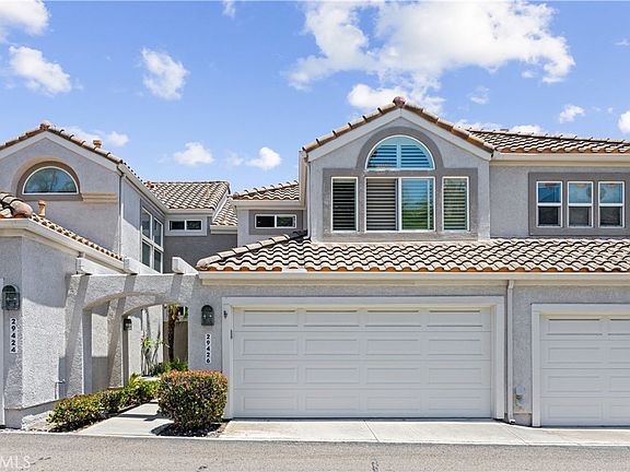Beautiful home in the highly desirable Capri community located in the city of Laguna Niguel. Pristine and bright home with neutral colors through out just waiting for your personal touch to complement the palette of your choice. As you enter the front door you are greeted by white oak floors that lead you to an expansive open living room with soaring high ceilings. Natural light cascades in which highlight the openness of the living room design. This two story home offers 2 bedrooms and 2 full baths upstairs and 1 half bath conveniently located downstairs. The home has been thoughtfully designed for ease of movement. Entertaining will be a pleasure in this living room space thanks to a convenient slider adjacent to dining room for easy access. The kitchen is beautifully designed with a window that permits you to see the landscape outside and enjoy the beautiful outdoors along with Quartz counter tops. The kitchen has been upgraded with custom made wood cabinets, custom kitchen pullouts throughout and as an added bonus- a pull out pantry that enhances the design. A custom back splash adds an eye catching detail that bounces reflective light. High end stainless steel appliances are included like Bosch refrigerator and dishwasher, a New Air wine refrigerator, 5 burner Dacor luxury range stove and a Sharp microwave. The adjacent dining room conveniently has a slider that takes you to a large patio- perfect for your morning coffee or entertaining. Pendent lighting adds a touch of elegance in the dining room. The home features crown molding through out which enhances the modern floor plan design. The attached garage provides easy access to your Samsung washer and dryer and with groceries. The garage has a 2024 new Lift Master Garage door opener. The new water heater was installed in 2024 and is permitted. The upstairs offers two spacious bedrooms each with a fan and two upgraded bathrooms. The spacious primary bedroom is both light and bright with a ceiling fan and offers a custom walk in closet. Additionally the primary bathroom offers custom quartz tile, towel warmer and custom shower niches and dual sinks for your convenience. Enjoy many resort -style amenities including a sparkling pool, spa, walking trails nearby and beautifully maintained grounds. This home is conveniently located to shopping, dining, and award winning schools. Walk at nearby beaches and enjoying sunset views will be a delight.