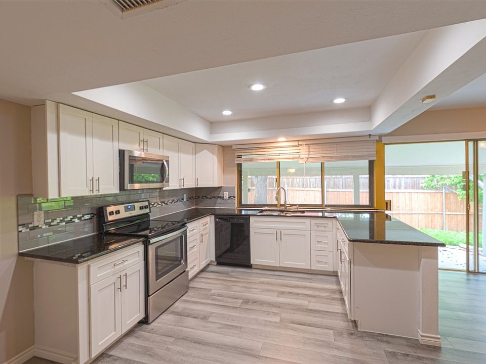 Open House this Sunday ( April 16th, 1-4pm). Must see it! New laminated wood floor in living, dining, hallway, Kitchen and family room, totally renovated kitchen family home located at establish neighborhood. White cabinets with black granite countertop and stainless steel appliances. New vinyl flooring in bathrooms. New carpet in all three bedrooms. Ceiling fans in family living room and all bedrooms. Updated lighting fixture in living room, dining room. All windows covered by 2 inch blinds. Extended covered patio. Greenbelt and Carrollton orange walking trail is behind the backyard. House is located within walking distance to Thompson Elementary School and City of Carrollton Woodlake outdoor tennis court. Greenbelt Disc golf course is right behind the house. Easy access to shopping and school.
