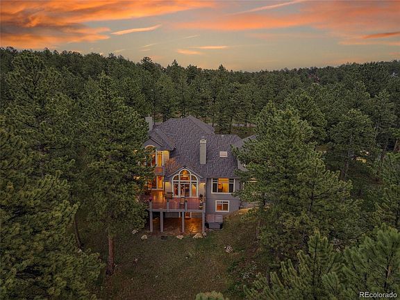 Experience refined mountain living in this custom-built luxury home, perfectly situated in Evergreen’s prestigious Ridge at Hiwan neighborhood. Set on a serene, usable 1-acre lot, this stunning retreat blends mountain tranquility with sophisticated elegance—just minutes from I-70, 30 minutes to downtown Denver, & close to Bergen Village, Elk Meadow Open Space, & Hiwan Golf Club. An arched stained-glass entry welcomes you into a warm & light-filled interior with soaring ceilings, hardwood floors, & refined architectural details. Just off the entry, double doors open to a spacious main-floor office featuring two windows for inspiring natural light. The formal living & dining rooms are perfect for entertaining, with elegant flow & a double-sided gas fireplace shared with the comfortable great room. Floor-to-ceiling windows frame stunning views, the newly refinished deck invites indoor-outdoor living in this peaceful mountain setting. The chef’s kitchen is designed to impress—spacious, polished granite countertops, a large center island and peninsula with seating, Sub-Zero refrigerator, double ovens, two sinks, a natural gas 5-piece cooktop, Bosch dishwasher, trash compactor, & natural gas hookup & grill just off the kitchen. An additional dining room sits off the great room, drenched in natural light & framed by floor-to-ceiling glass-paneled doors that lead to the deck. Upstairs, the vaulted primary suite is a private retreat with hardwood floors, a fireplace, balcony access, & a spa-inspired 4-piece bath with walk-in closet & open tile shower. A guest suite with private bath, plus two additional bedrooms with a shared Jack-and-Jill bathroom, complete the upper level. The finished walk-out lower level includes a family room, 5th bedroom, full bath, bonus room, & access to a flagstone patio with hot tub. Three-car garage, main-floor laundry room, central vacuum, whole-house humidifier, radon system, & a fire hydrant on the lot! https://v1tours.com/listing/photos/57785/