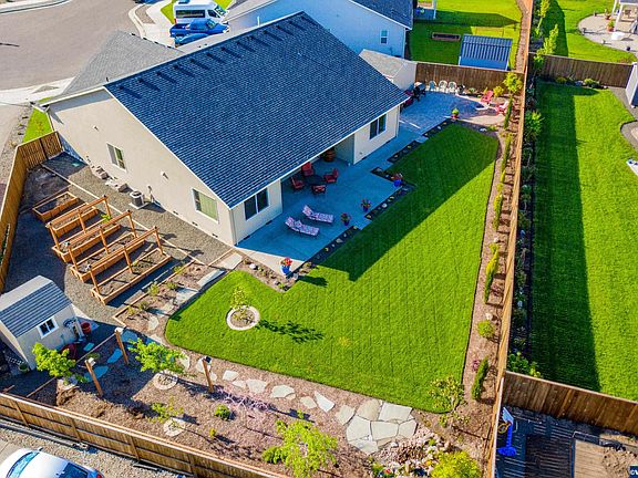 UPGRADES, UPGRADES , UPGRADES!!! Cul-De Sac. 3 car, Open flr plan, Vaulted ceilings, upgraded appliances. Primary Suite w/ vaulted ceilings, dual undermount sinks, 19x7 walk in closet. Custom blinds throughout, Laminate floors. Covered patio w/ 19X33 patio, Extended driveway w/ concrete pad for "SMALL RV / Trailer, sidewalks, Paver patio fire pit, Waterfall feature, Fruit trees, Lawn ,beds & garden fully irrigated. Shop w/power, Garden shed w/power, Lighted attic. Attention to detail. Too much to list