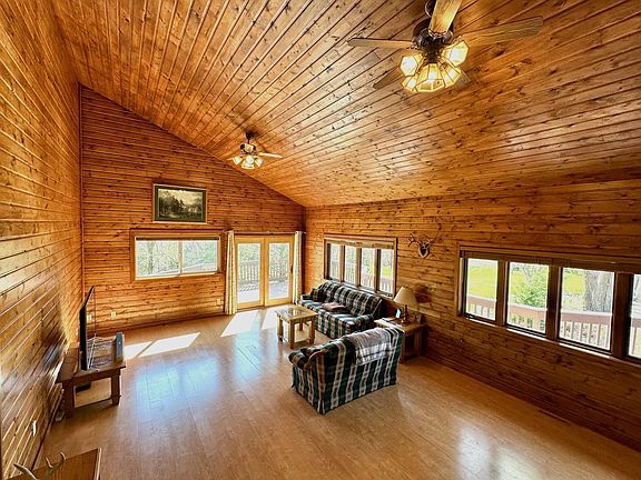 Escape to your very own sanctuary nestled on 7 acres, where serene pond views and abundant wildlife greet you daily. This rustic multilevel retreat welcomes you with knotty pine walls and vaulted ceiling in the living room creating a warm and inviting atmosphere. The kitchen offers plenty of cabinetry, a breakfast nook and stainless-steel appliances. Perfect for everyday living and entertaining. The main floor features a convenient guest bathroom. Step upstairs to the spacious primary bath which boasts separate vanity areas, a luxurious jacuzzi tub, walk-in shower and walk-in closet. On the lower levels discover a bedroom, full bath and a comfortable family room with a charming brick fireplace and walkout access, ideal for gatherings. going further expands the living space with a game room or can be converted to a fourth bedroom very easily. It also features an additional walkout to the south, along with a large utility room for added convenience.