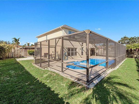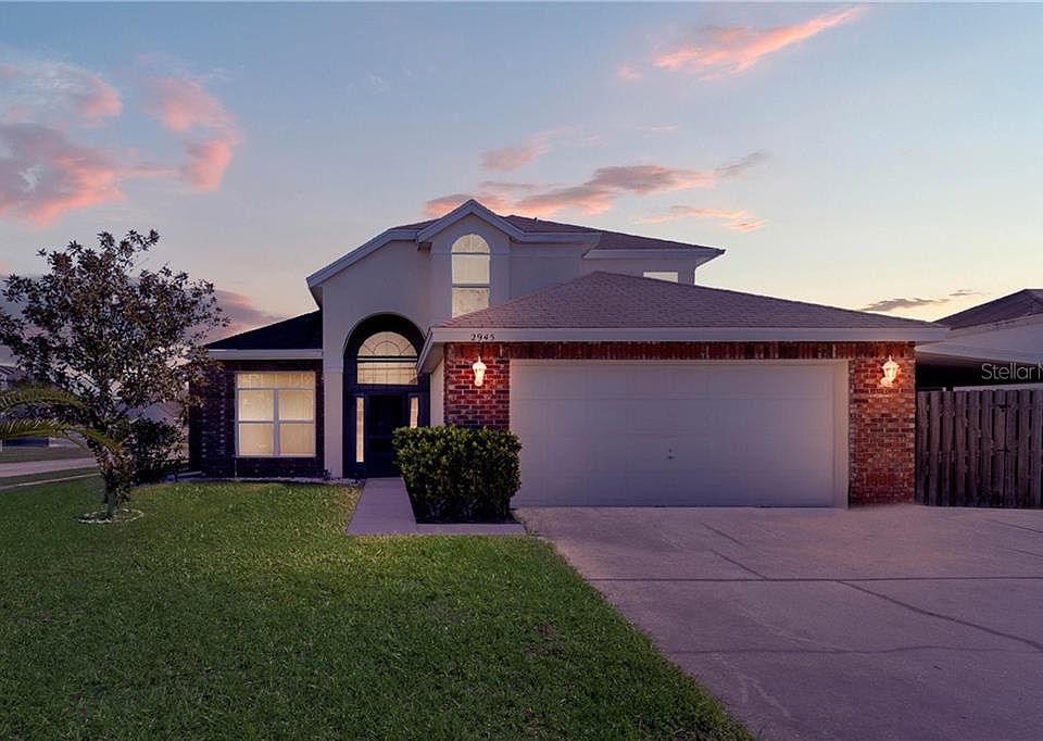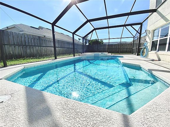 Location Location Location! This spacious 4 bed 2.5 bath pool home sits on a fenced corner lot in a quiet community. Pulling up you will be impressed by the gorgeous brick exterior and oversized driveway. Vaulted ceilings greet you as you enter the home. Formal Dining room to your left which connects seamlessly to the kitchen featuring bar top and plenty of counter space. Dining nook connected to the kitchen. French door leads to the huge screed lanai with large deck & pool, perfect for cooling off after a day at the parks or entertaining friends & family. Large first floor master suite featuring shower, garden tub, dual sink vanity, and private water closet. Three additional bedrooms, laundry room, plenty of storage, 2 car garage complete this home. No HOA! Minutes from Disney, Margaritaville, Island H20 Live, Sunset Walk Shopping center, major roadways, restaurants, Old Town and the parks. Perfect starter home or Investment opportunity. Call now for your private showing.