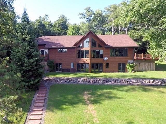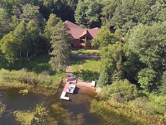 PINE ISLAND LAKE EXECUTIVE! 400 acres of protected land w/ recreational trails is just 1 of many features at this lakefront retreat! Pine Island Lk; a 76 ac private lk offers fabulous fishing & magnificent views! Gorgeous 4 Bedroom, 4 Bath cedar sided home has 5500 sq ft of custom details. Curb appeal is at its optimum as you pull up to the immaculately landscaped grounds. Quality is evident as you walk in; interior is warm w/ the half log walls, wood floors & lakeside windows that grab your eyes & pull you into the beauty of the Northwoods! Floor to ceiling fieldstone fireplace adds to the warmth/ambience. Cathedral ceilings enhance the openness of the space. Kitchen has quality cabinetry, island area & stainless steel appliances. Master bedroom suite has a whirlpool tub & walk-in closet. Lower level has a rec room for family fun plus 2 spacious bedroom suites, each with their own bath. 4-car garage, heated workshop & 200' sand frtg. All on 3.8 ac; truly a most captivating setting!