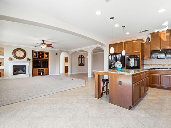 Northwest single-story home offers 3 bedrooms and 2 baths. Home has crown molding,2-inch wood blinds throughout,tankless water heater,whole house fan. The forth bedroom option was changed to an office when home was built in 2011. Kitchen features duel ovens,granite countertops and a island with pendant lighting in addition to a nook area. The property also includes a pantry cabinet with pull out shelving and additional storage cabinetry throughout the home. Next to the great room with fireplace is a seperate dining area. The split floor plan places the master suite on the oppsite side of the home from the other 2 bedrooms, which includes a walk-in closed. Both bathrooms are designed with tile vanities and duel sinks, as well as tile showers and tubs. The laundry area,centrally located, is equipped with a sink and extra cabinets. The property includes a 22 ft deep two-car garage that allows for standard pickup inside parking. The third car garage was converted when home was built to a work area with cabinetry storage. There is a covered extended rear patio measuring 34 ft. by 8 ft. The front and backyard have landscaping with lighting. On the Eastside of the home there is 12 ft. sideyard setback from home providing extra yard space. The Westside has a 8 ft. sideyard setback from home with cement walkway and 3 storage units. The lot is 7,840 sq. ft. Call your Realtor Today to See.