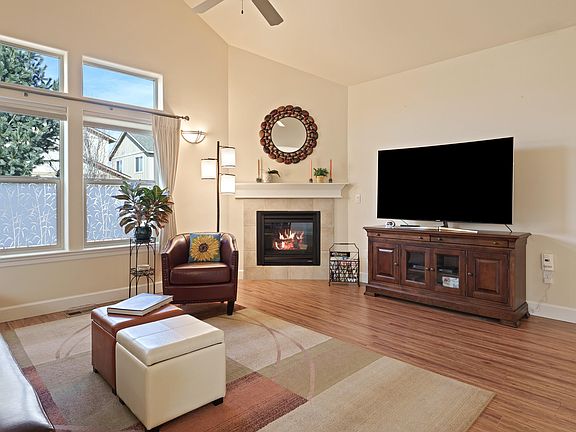 Charming, single level, corner lot, 3 bedrooms 2 bath, 1622 sq ft with a 5600 sq ft lot in Eagle's Landing. Quality built, South facing home by Choice 1 Builders. Open floor plan with a corner fireplace, built in covered patio with an oversized two car attached garage. Newer exterior paint job by Webfoot Painting. One block from Mountain View Park and a short distance to Mountain View High school. Primary suite with great separation from the front two bedrooms.