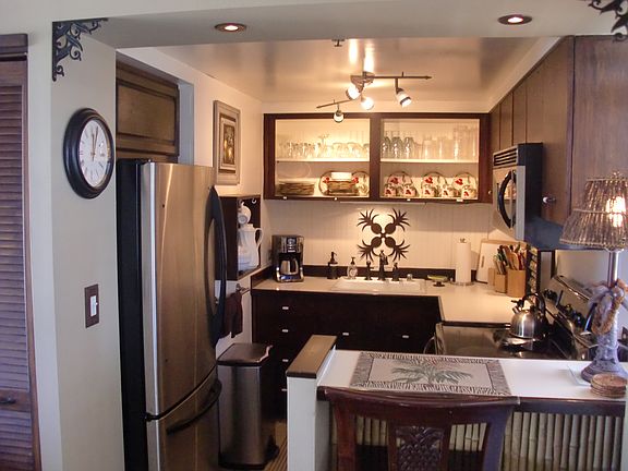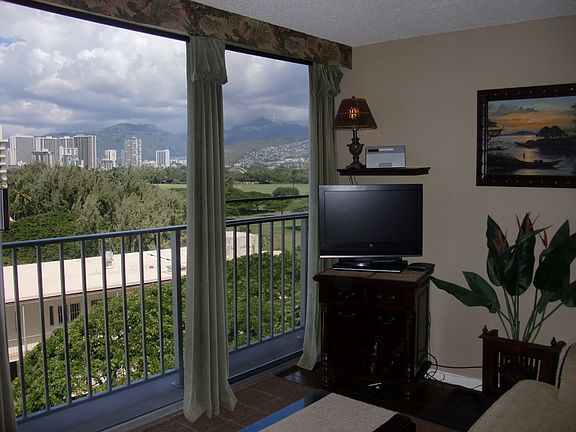 High Floor with Full Kitchen 'Residential' Suite. Look-out in either direction from main living room in this 1-Bedroom condo & see the surf as it breaks. Sit on the cushy sofa & gaze out at the ocean, cityscape, park, & mountains. The beautifully furnished, living room inclds Indonesian, dark-wood, plantation-style furniture, flat screen TV & dining table for 2. Open the windows on each side of the unit for the trade winds. A unique feature of the building is that each floor is only one unit wide, so getting a cooling cross breeze is accomplished by opening windows on each side of the unit.
