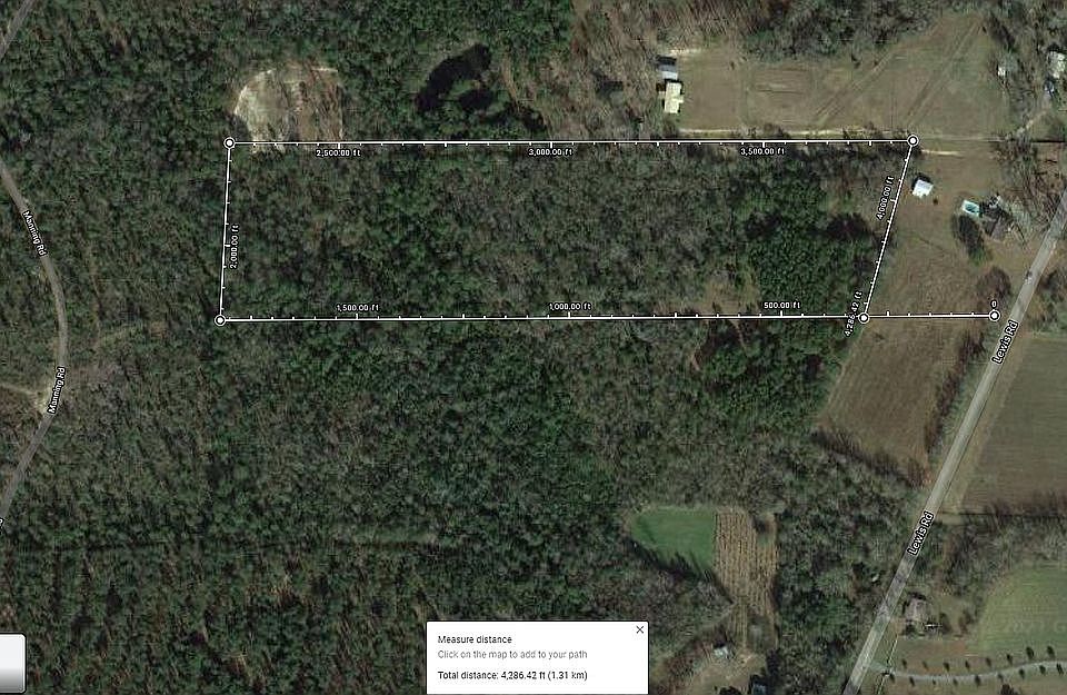 This is vacant land with no home on it.15.3 acres total divided into 1.8 acre and 13.5acre parcel. The entrance to property off Lewis Rd is 30' wide and located just south of 2951 Lewis Rd which is the home with pool in photo. Boundaries shown in photos are fairly accurate with the south boundary lining up with the entrance and north boundary located about 30' into clearing of neighbors yard. Front 1.8 acres is mainly planted pine and 13.5 acre was a pasture 20-30 years ago with scrub oak and scattered large oaks and some magnolias. The property has a gentle slope from front to back and there is a 3' wide spring fed creek that runs year round at rear of property. Beautiful piece of property with lots of wildlife.