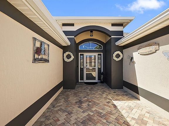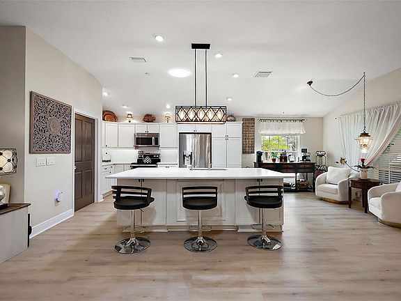 ABSOLUTELY STUNNING, BEAUTIFULLY RENOVATED, EXPANDED 3/2 BLOCK and STUCCO LANTANA with IMMENSE 442sf CLIMATE-CONTROLLED FLORIDA ROOM, and OVERSIZED, EXTRA DEEP, 544sf garage with room for TWO CARS + GOLF CART, on a LARGE CORNER LOT, CONVENIENTLY NESTLED between Lake Sumter Landing and Brownwood Paddock Squares in the HIGHLY DESIRABLE Village of Sanibel! As you approach this INCREDIBLE home, you can’t help but notice the beautiful BRICK-PAVER driveway, TIERED landscaping, and SPACIOUS FRONT PATIO—ideal for RELAXING in the Florida sunshine or ENJOYING fun-filled OUTDOOR ENTERTAINING with friends! A double side-lit, leaded-glass door with large transom window welcomes you in to the bright SPACIOUS foyer with a convenient ENTRY CLOSET. Throughout the home, you will discover LUXURY VINYL PLANK FLOORS, HIGH CEILINGS, 5 1/4” BASEBOARDS, and newly PAINTED interior—all creating a fresh and modern feel. The MAGNIFICENTLY RENOVATED KITCHEN boasts an ENORMOUS center ISLAND with DOUBLE-SIDED cabinets and a THIRD SIDE of DRAWERS, MODERN VEINED-QUARTZ countertops, WHITE CABINETRY with PULL-OUT shelves, DOUBLE built-in PANTRY, STAINLESS appliances, UNDER COUNTER lighting, reverse-osmosis water-filtration, and an ADJACENT DINETTE area that is currently furnished as a COZY sitting space. Two newly added SOLAR TUBES add an ABUNDANCE of NATURAL LIGHT to the kitchen, living, and dining rooms. From the main living areas, 12' STACKABLE sliding glass doors lead you into an IMMENSE 442sf CLIMATE-CONTROLLED FLORIDA ROOM. This FABULOUS BONUS AREA features a MINI-SPLIT, 10' HIGH VAULTED ceilings, TILE floors, motorized window shades, three ceiling fans, full panel sliding glass doors, exterior French doors, and PRIVACY landscaping. In addition to this AMAZING room, there’s also an ADJACENT 12’ x13’ SCREENED LANAI with TILED floors and an exterior BRICK-PAVER grilling area. The luxurious primary bedroom features VAULTED ceilings and a CUSTOMIZED WALK-IN closet. Its en-suite bathroom boasts TILE flooring, rich WOOD cabinetry, GRANITE countertops, DOUBLE sinks, TILED ROMAN STYLE WALK-IN shower, built-in LINEN closet, make-up vanity, and separate water closet. Two additional bedrooms and a second bathroom are conveniently located near the front of the home ensuring plenty of PRIVACY for guests or home office. The second bedroom boasts a lovely TRAY ceiling, large BAY WINDOW, and a built-in closet. Bedroom three features a VAULTED ceiling and built-in closet. The second bathroom offers TILED floors, a rich WOOD vanity with GRANITE countertop, TILED tub and shower combination, and a hallway LINEN closet. A generous INTERIOR laundry room features TILE floors and a utility sink. The OVERSIZED 544sf EXTRA DEEP garage with room for TWO CARS + GOLF CART boasts EPOXIED floors and pull-down stairs with attic access for additional storage. DON’T MISS YOUR OPPORTUNITY TO OWN THIS SPECTACULAR HOME! The Village of Sanibel is ideally located between Lake Sumter Landing and Brownwood Paddock Squares; close to Sanibel and Captiva Pool and Recreation Centers; Bonifay, Havana, and Belle Glade Golf and Country Clubs; Roosevelt, Truman, Volusia, and Okeechobee Golf Courses; Sarasota Golf Academy and Practice Center; Colony Shopping Plaza; and 466A with an abundance of shopping, restaurants, banks, medical, and more! PLEASE WATCH OUR WALKTHROUGH VIDEO OF THIS EXCEPTIONAL HOME IN A FABULOUS LOCATION and call today to schedule your Private Showing or Virtual Tour!