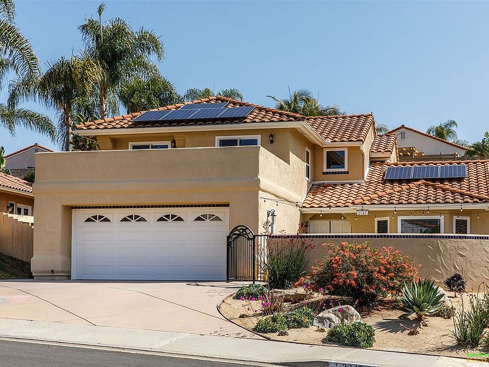Value range pricing - $949,000 - $999,000. Gorgeous Santa Fe Ridge home on more than a 1/4 acre lot with loads of upgrades! A custom flagstone courtyard welcomes you into this warm and inviting residence. The formal living room and dining room boasts vaulted ceilings and soothing paint colors. The upgraded kitchen features classic white cabinetry, granite counters, and stainless steel appliances. It flows seamlessly into a sunny breakfast area and fantastic family room with a cozy fireplace. Relax in the serene master suite with vaulted ceilings, a soaking tub, and dual vanities. The two secondary bedrooms both have access to an expansive deck. All bathrooms have been elegantly redone. Distinctive Acacia wood floors and bamboo flooring is used throughout the home. The massive park like backyard has a huge grassy play area and an extensive patio with plenty of room for a pool. Other features include tall baseboards and crown molding. Leased solar panels make this home energy efficient, and there is central air conditioning. One bedroom and full bathroom is conveniently located on the first floor. Students attend top rated Encinitas schools. Low HOA. No Mello Roos. Minutes to beautiful beaches, fantastic shopping, delicious restaurants, and world class golf. This is truly a wonderful place to call home!