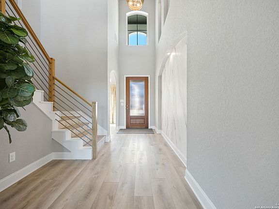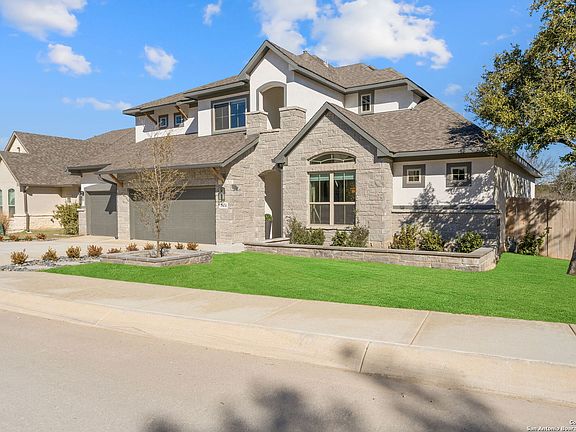 Better than new! Owners customized house to be their "forever" home, but unexpected job change took them up to Dallas. House sits on a stunning lot, with big hill country views and mature oak trees. Two stories, 4 bedrooms, 4.5 baths. Downstairs has dining room/home office, large family room with gorgeous tiled floor to ceiling fireplace, chefs dream kitchen with massive quartz island, double ovens, top of the line 48" cooktop, lighted glass cabinetry to ceiling, custom backsplash and pot filler. Master Bath has custom his/hers vanities, w/custom light fixtures, large soaker tub with picture window/gorgeous view, walk-in shower and California style custom closet. Additionally, downstairs consists of second bedroom with ensuite bath, powder room, laundry with sink, refrigerator and lots of storage. Beautifully upgraded/custom stairway will take you up, where you will find a built-in wet bar (can be removed and converted to play room), theater/media room and 2 additional bedrooms each with ensuite baths. Stone/Rock & Stucco exterior, 3 car garage with ample, overhead storage racks and epoxy floors. House is in gated subdivision, on a large LOT, with amazing views! Yard is very low maintenance. Way too many upgrades to mention, including the beautiful, large TREX deck that extends from the patio, making it the perfect spot to relax or entertain, and enjoy the fabulous views! House is less than 1 mile from Fair Oaks Golf and Country Club, and less than 5 minutes from the newly constructed Lemon Creek Ranch, with state of the art H-E-B anchor store!
