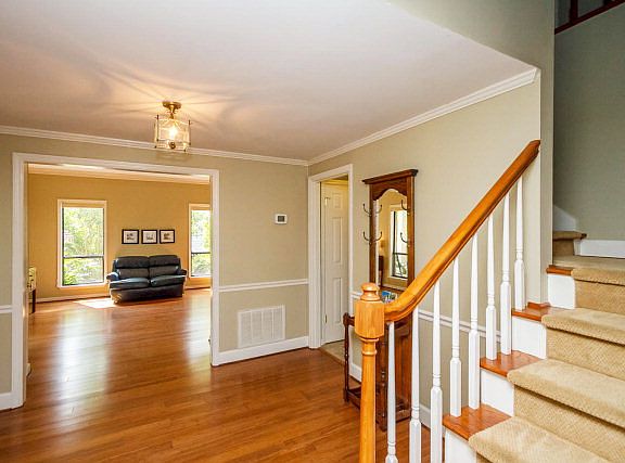 Many upgrades. Granite counter tops, stainless steel appliances in kitchen. Study, living room, dining, room, laundry room and huge kitchen looking out on beautiful low maintenance back yard with many large old trees. Hardwood floors and ceramic tile throughout first story. Carpet throughout second story. Yard has sprinkler system front and back. Porch in front, patio in back. Dual fuel energy efficient HVAC up and down. Pull down for attic storage over garage: fully floored. Neat. Clean. Well maintained. City bus to Davidson Fine Arts School.