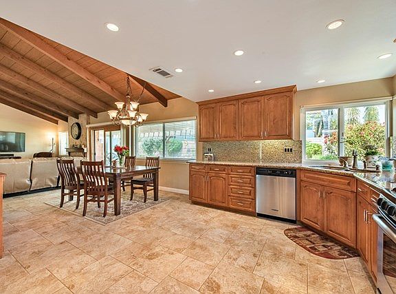 Highly desirable single story Fountainwood 4+2 home located in a cul de sac! Featuring separate formal living/dining/family room spaces with vaulted ceilings and updates throughout, this one has it all and is ready for a new family! Open kitchen layout with natural wood cabinets, granite slab counters/backsplash, and stainless steel appliances! Eat in kitchen area flows nicely into the living room which is warm & inviting perfect for entertaining with a huge fireplace feature, wood beam ceiling vault, and patio slider with dual pane windows galore bringing light and the great outdoors right inside! Beautiful tile flooring from the entry into the main living areas and down the hallway bringing you to the great sized bedrooms and the powder bath upgraded with modern style vanity, tiled tub shower space and accessible from right outside the back patio as well. Master bedroom has 2 large closet spaces, a patio slider to backyard as well as a master bathroom finished with a dual sink vanity cabinet and a huge walk in tiled shower complete with bench and niche! Smooth ceilings with recessed lights, updated doors/trim, and tons of storage throughout! Picture perfect backyard, 3 car finished garage, and an elevated curb appeal make this home one you cant miss!!