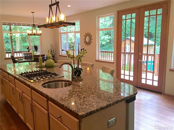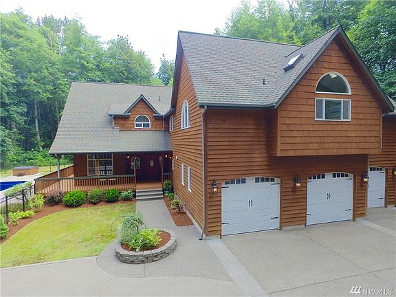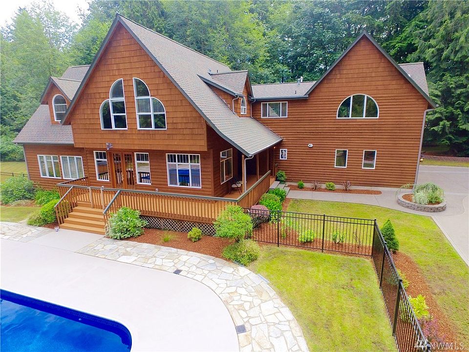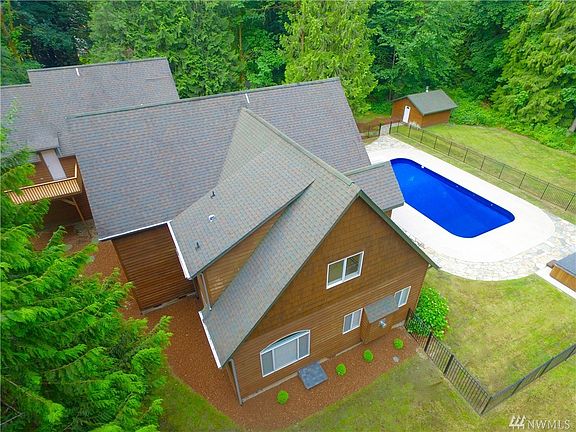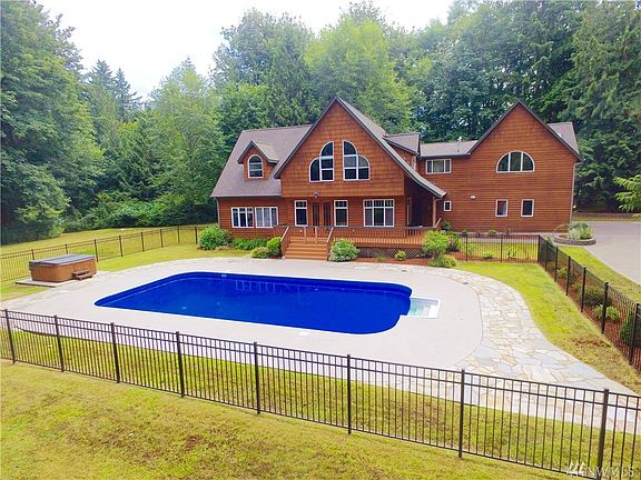 Spectacular seclusive retreat on 6.31 acre privately wooded estate built from the cedar surrounding the property. Spacious kitchen boasts of long granite island, nook,french doors lead to the wrap around deck, oversized in-ground pool w/liner & hot tub. Upstairs you'll find stunning 16 foot± vaulted ceilings & master suite w/ wet bar, study w/built in bookshelf, huge 6-piece bath, fireplace, & private deck. All bedrooms w/attached bath. Opportunity awaits for a secluded getaway, right in town!