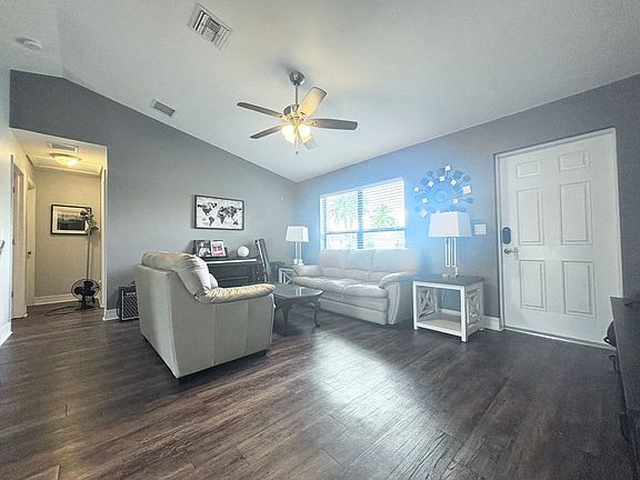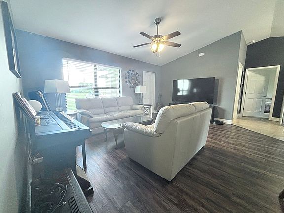 This home was built in 2019 and features a fenced yard on a HUGE triple lot. Located in a great area of SW Cape Coral right off of Skyline Blvd and Veterans. The tall ceilings allow the flow of natural light and give an open feeling throughout the home. Entertain your family or friends while they sit at the breakfast bar and you prepare a gourmet meal. Cooking for family and friends is easy in the spacious kitchen that features lots of cabinetry for storage, stainless steel appliances, and a HUGE counter space. The master bedroom features lots of closet space to store your clothes and treasures. No more trips to the laundromat! The indoor laundry room is equipped with a washer and dryer. No more worrying about the kiddos or fur babies running off as they play in the huge yard because it comes with a fence. There is a small bonus room in the garage that can be used as a workshop, man cave, or for storage - It is AIR CONDITIONED. Just minutes away from shopping and restaurants - Target, First Watch, Home Depot, Lowes, Outback, and much more.
