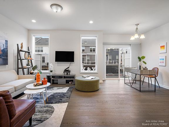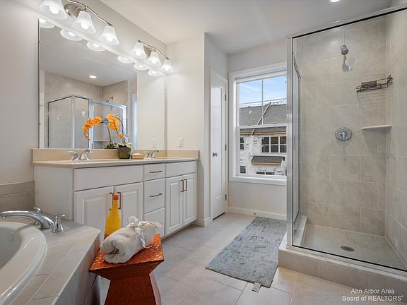 North Oaks luxury Fulton Modern Townhouse - Move in NOW! No need to wait for new construction. Perfect location and lifestyle. Minutes to north campus, medical campus and downtown Ann Arbor. 2,615 sq ft and 4 levels of living space. Entry level - office/bedroom with full bath and 2 car garage. Level 2-upgraded luxury kitchen, quartz counter and Huge island w seating. Upgraded cabs. Upgraded wood floors throughout 2nd level. Level 3- luxurious primary suite with separate tub and shower, large walk in closet w/organized living closet system. 2 additional bedrooms and full laundry w storage. Top it off with a 4th level rooftop terrace and loft with separate heat & A/C. Unbeatable amenities and location! Townhomes feature no share walls w/firewall and air gap - you won't hear your neighbors! E Enjoy resort style amenities with a state-of-the-art fitness center, locker rooms, media and gathering area, bar, billiards, outdoor lap and wading pools, and a yoga room. Walking trails and parks abound. Ann Arbor schools - Walk to Logan and Clague. Nothing to do but move in!!, Primary Bath