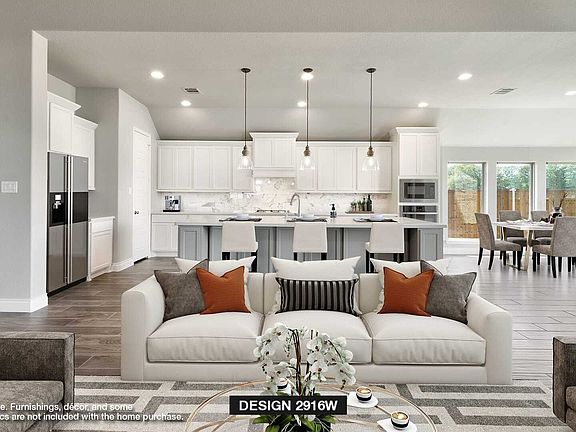 Extended entry with 12-foot ceiling leads to open family room, kitchen and dining room. Family room features a 12-foot ceiling, wood mantel fireplace and wall of windows. Kitchen features generous counter space, walk-in pantry, 5-burner gas cooktop and island with built-in seating space. Game room with French doors just off family room. Primary suite includes bedroom with 13-foot ceiling and wall of windows. Dual vanities, freestanding tub, separate glass-enclosed shower and two walk-in closets in primary b