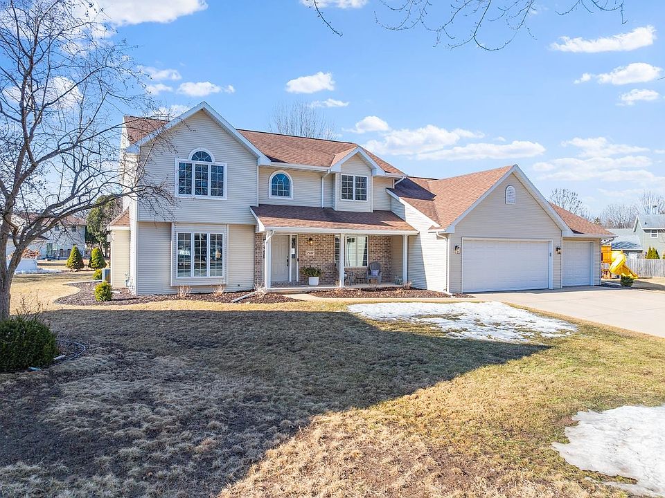 Beautifully updated 3BR/2f+2hBA Colonial on a cul-de-sac lot near parks & schools greets w/ a neatly landscaped lot ('23) opening to 2-story foyer w/ new sidelites. Large LR w/ gas FP & large windows overlooking back-yard w/ impressive stamped 750 sqft patio! Kitchen w/ appliances, pantry, island. 1st floor laundry & guest bath near entry to 3+stall garage w/ tandem park, reznor heater & bsmt acc. Office & front hall w/ nifty locker closet complete main level. Upper offers a large primary suite w/ cathedral ceiling, walk-in closet w/ organizers, & full dual-vanity bath. 2 add'l large bedrooms share a 2nd full bath w/ dbl vanity, modern fixtures & gorgeous hex-tile floor. LL adds 450 sqft composed of a fam-rm w/ 96" quartz dry-bar & half-bath.