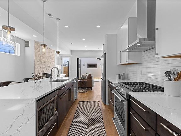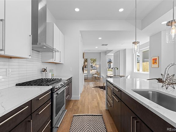 Welcome to 2949 Elati, a new contemporary townhome available in the super-hot South Broadway (SoBo). Enjoy 3 stories of functional living space with a west facing rooftop balcony and mountain views! This well imagined 3 bed 5 bath end unit with southern exposure features solid white oak floors, kitchenAid stainless steel appliances, modern soft close cabinets, walk-in pantry, durable quartz counters and panoramic doors opening to your private backyard. Unwind in your spacious second level primary suite with luxurious bath, double vanity and walk-in closet. An ideal layout with two more bedrooms on the second level both with ensuite baths and convenient laundry. The third level offers a flex/bonus room with wet bar and west facing balcony ideal for entertainment. Additional amenities include 10' ceilings on the main level, Anderson Windows (white inside, anodized bronze exterior), cedar privacy fence, professional landscaping, detached two car garage, dual A/C, high efficiency furnace & water heater, and heat recovery ventilator. See why many consider this location to be the best value in central Denver with nearby access to DU, Platt Park/Wash Park, .7 miles to light rail, and just a short stroll to the heart of Englewood offering countless entertainment and dining options.