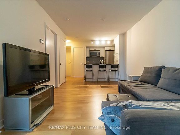 Enjoy open-concept living in this 1-bedroom, 1-bath suite in the heart of the Entertainment District. The bright living and dining area features durable laminate flooring and a large window that fills the space with natural light, plus a walkout from the living room to a 43 sq ft balcony for fresh air and city views. The modern kitchen offers stainless steel appliances, quartz counters, sleek cabinetry, and a convenient breakfast bar for casual meals or work-from-home days. The bedroom is a comfortable retreat with space for a queen bed and storage. In-suite laundry adds everyday convenience. Residents enjoy outstanding building amenities including a fitness centre, party and media rooms, concierge, and inviting lounge spaces. Prime location steps to St. Andrew Station, the 503 streetcar, Rogers Centre, CN Tower, the Financial and Entertainment Districts, world-class dining, shopping, the PATH, and more. Move-in ready and fully furnished for easy downtown living. *Please note that the photos are from a previous listing.