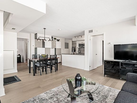 Corner suiteFloor-to-ceiling windowsOpen-concept living spacePanoramic city viewsSleek kitchenStylish finishes