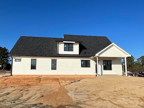 Gorgeous Artisanal designed new construction home on just under 1 acre! Exterior is adorned with brick and decorative wood accents, black vinyl windows and gutters. A large covered front porch and covered back patio offer plenty of room for outdoor entertainment and relaxation. Foyer is flanked by a formal dining room and office. Living room opens up with soaring ceiling and showcases the loft overlook from second level. Kitchen has large island, quartz countertops, subway tile and herringbone tile backsplash, and soft close drawers. There is also a pantry, a laundry room, and a powder room conveniently located. Primary bedroom on the main level with large walk-in closet, en suite bath with double sinks, tiled walk-in shower, private toilet room and linen closet. Upstairs primary bedroom has en suite bathroom and two large closets. Two additional guest bedrooms, a full guest bath with double vanity, and a bonus room complete the second level. No HOA or CCR's but just a short drive from Whispering Pines and Southern Pines. Builder is offering up to 10k as buyer incentive to be used for fencing or a rate buy down!