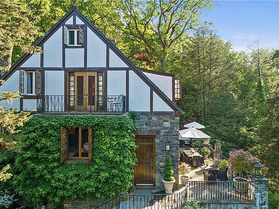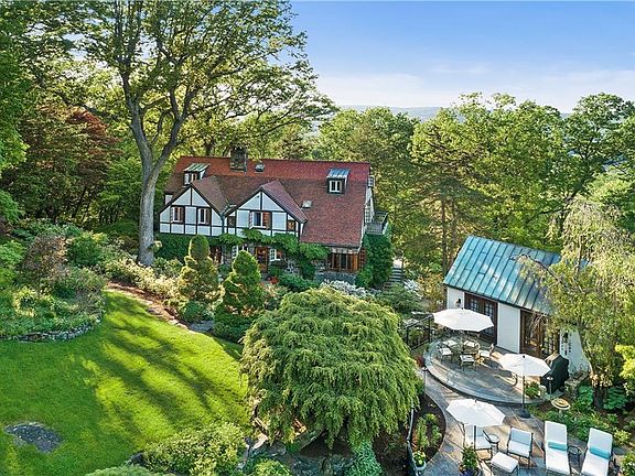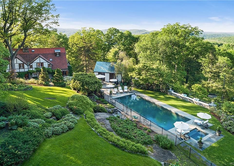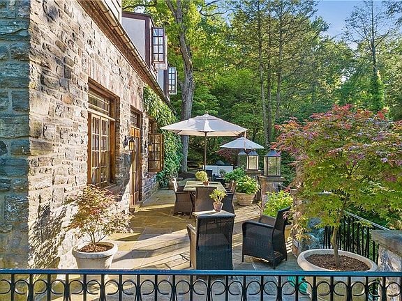 Sited to take in a commanding distant view, impressive stone and stucco country house. Originally built in 1931, exquisitely renovated and updated carefully integrating the old with the new. 4500 square feet with perfectly scaled and finely finished rooms. Wide plank floors, French doors, aged paneling, stucco walls and exposed beams. Captivating Living Room with high ceiling with exposed beams, fireplace and French doors to terrace. Dining Room with raised paneling. Kitchen with distinctive French stone floor. Library with doors to rear terrace with koi pond. Master Suite with Fireplace. Four additional Bedrooms. Nearly five acres in an area of fine country homes and estates. Long, gated drive to exceptional grounds with beautifully flowering gardens and specimen trees. Heated Pool House overlooking the Pool with Spa.