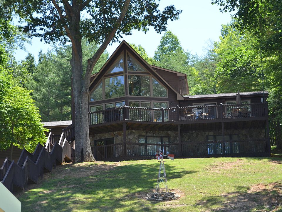 This lake front home captures family style with lake front living. The first floor includes living room, 2 bedrooms, 1 bath, kitchen, dining and open den with fireplace and deck. The upper level is the master suite with private deck. Lower level has 2 bedroom 2 bath, family room and game room that opens to a patio with walkway to the lake and 2-bay covered boat dock. great views.